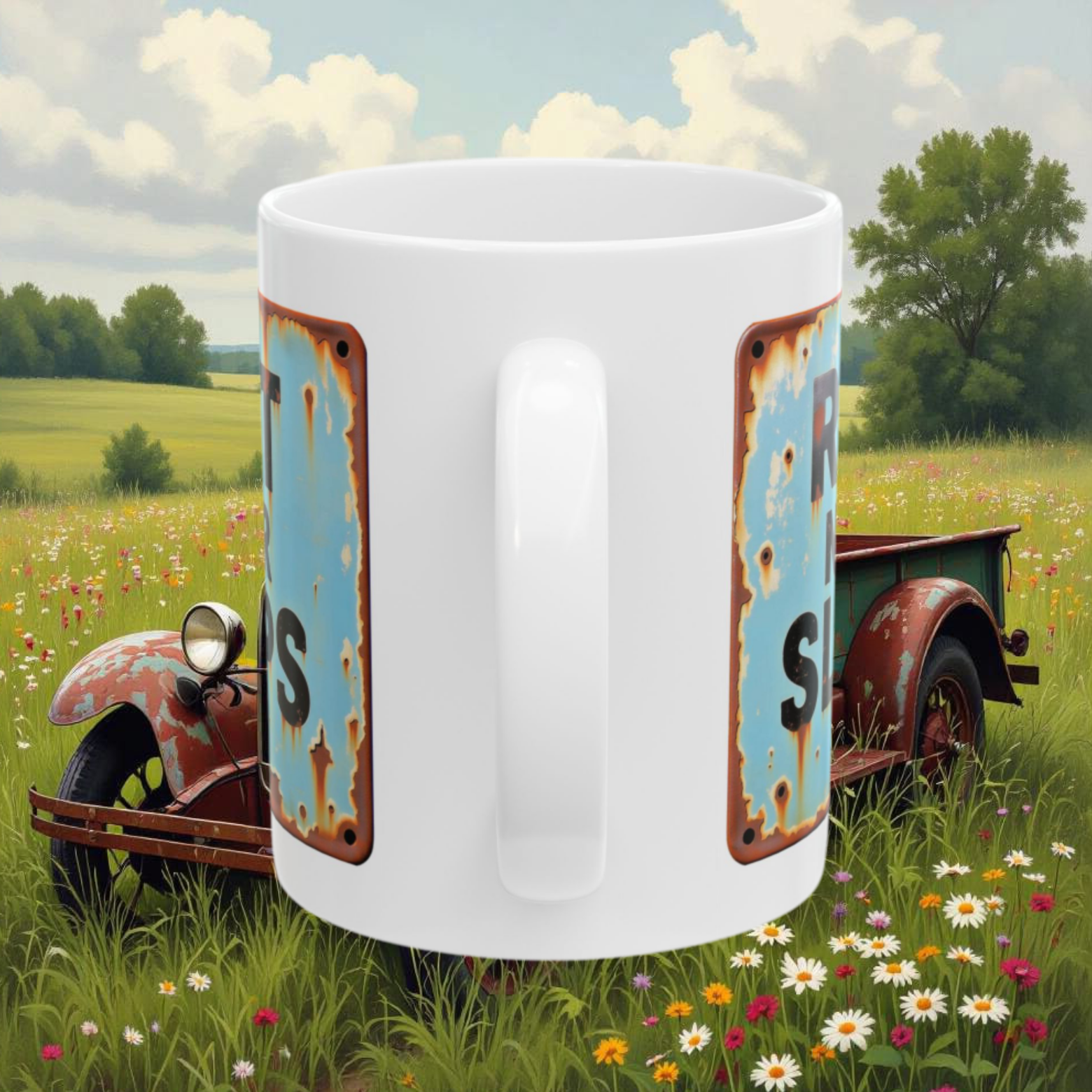 An 11 oz.ceramic mug featuring a rusting, peeling vintage sign that states 'Rust Never Sleeps'. Perfect for coffee or tea lovers who appreciate a vintage, rustic vibe. Great for gifting on Father's Day, birthdays, or as a unique, everyday mug for the home or office.